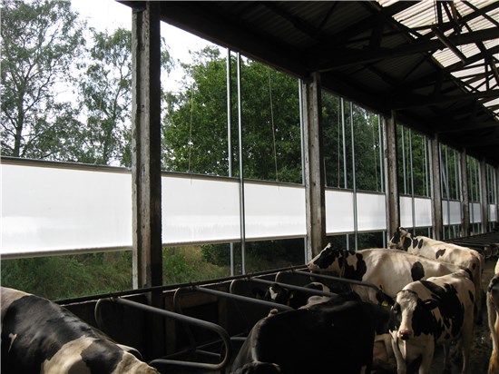 Боковая вентиляция: Что выбрать – вентиляционные шторы или поликарбонатные окна!? Высокая температуры окружающей среды приводят к значительному теплоизлучению в коровнике. Благодаря светопанелям из поликарбоната, пропускающим УФ, нагрузка теплового излучения также значительно возрастает. Поэтому применение подобных светопанелей рекомендуется только в случае необходимости (в регионах, где температура летом не превышает +25оС). В регионах с повышенным солнечным излучением рекомендуется установка вентиляционных ПВХ штор, изолированных крыш, а также инсталляция гелиоэнергоустановок на их южной стороне.